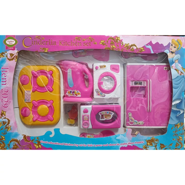 مجموعه لوازم خانگی بازی کودکان یخچال و گاز و ماشین لباسشویی و چای ساز و مایکروفر باکس کادویی