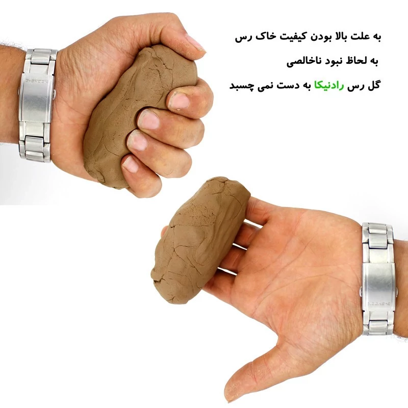 خاک رُس به کانیهای طبیعی آگلومره شده شامل فیلوسیلیکات آلومینیوم آبدار گفته میشود که با افزودن رطوبت کافی ویژگیهای پلاستیک پیدا میکنند و با خشک شدن سفت می شود. در طبقهبندی خاکها، رس در گروه ریزدانه قرار میگیرد. ذرات رس معمولاً با اندازهٔ کوچکتر از 0٫002 میلیمتر تعریف میشوند. اما گاهی مواقع ممکن است ذراتی با اندازهٔ 0٫002 تا 0٫005 میلیمتر نیز رس تعریف شوند. ذراتی که بر حسب اندازه، در طبقهٔ رسها قرار میگیرند، لزوماً شامل کانیهای رس نمیشوند. رسها در مکانیک خاک به ذراتی اطلاق میشود که اگر با مقدار محدودی آب مخلوط شوند، خاصیت خمیری از خود نشان میدهند. خمیری بودن، خاصیت بتونه شکلی است که رس مخلوط با آب از خود نشان میدهد. پس هر خاک ریزی رس نیست و باید از معدن آن این خاک تهیه شود. گل رس رادنیکا تهیه شده از گل رس خالص و با کیفیت معدنی می باشد که ناخالصی چه از بابت زباله ها و چه از بابت مخلوط شدن خاک های دیگر که موجب تبدیل شدن گل رس به گل گلدانی می شوند را ندارد. گل رس رادنیکا دارای رطوبت کنترل شده و استاندارد می باشد و این موضوع باعث می شود به دست فرزند دلبندتان نچسبد. برای انجام کارهای حرفه ای استفاده از آب الزامیست. نحوه نگهداری بعد از باز شدن محصول: فقط کافیست از تبخیر آب محصول جلوگیری کنید. در صورت خشک شدن جزئی بعد از استفاده با مقداری کمی آب (در حد چند قطره) مخلوط کرده و در کیسه فریزر نگهداری کنید. نحوه خشک کردن محصول تولیدی: خشک کردن به آهستگی و به طور مساوی بهترین روش است. محصولتان را روی جایی بگذارید که هوا در اطرافش در جریان باشد. ظروف سفالی را با استفاده از دستگاه های گرم کن یا دمنده هایی با جریان هوای گرم مثل سشوارها به سرعت خشک نکنید. چنین کاری می تواند دلیل ترک خوردن سفال به خصوص وقتی گل به سفتی چرم یا خشک تر است باشد. وزن محصول: 500گرم (امکان 10 گرم خطا در وزن کشی وجود دارد)