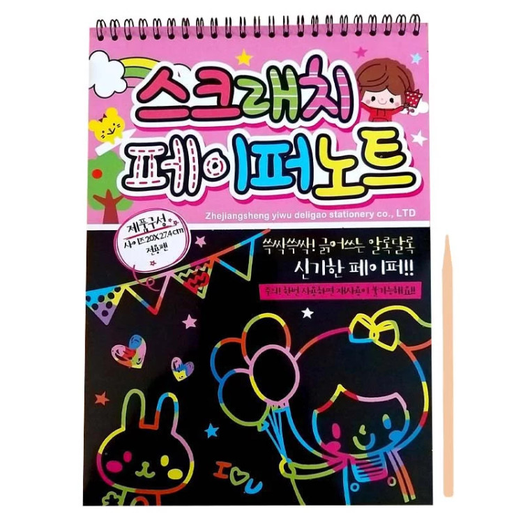 این دفترچه جادویی 6 برگ ضخیم مشکی دارد و یک مداد مخصوص نیز در بسته بندی این محصول وجود دارد . با کشیدن قلم چوبی مخصوص روی صفحات مشکی و ایجاد خراش ، طرحهای هیجان انگیز خلاق و رنگین کمانی ایجاد کنید و لذت ببرید. جالب است بدانید از این دفترچه می توانید بصورت نا محدود استفاده کنید و اگر صفحات خالی تمام شد می توانید یک لایه گواش مشکی روی صفحات آن بکشید و منتظر بمانید خشک شود،اکنون مجدد شما فرصت این را دارید خلاقیت خود را به نمایش بگذارید.