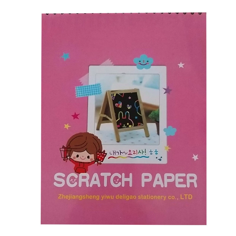 این دفترچه جادویی 6 برگ ضخیم مشکی دارد و یک مداد مخصوص نیز در بسته بندی این محصول وجود دارد . با کشیدن قلم چوبی مخصوص روی صفحات مشکی و ایجاد خراش ، طرحهای هیجان انگیز خلاق و رنگین کمانی ایجاد کنید و لذت ببرید. جالب است بدانید از این دفترچه می توانید بصورت نا محدود استفاده کنید و اگر صفحات خالی تمام شد می توانید یک لایه گواش مشکی روی صفحات آن بکشید و منتظر بمانید خشک شود،اکنون مجدد شما فرصت این را دارید خلاقیت خود را به نمایش بگذارید.