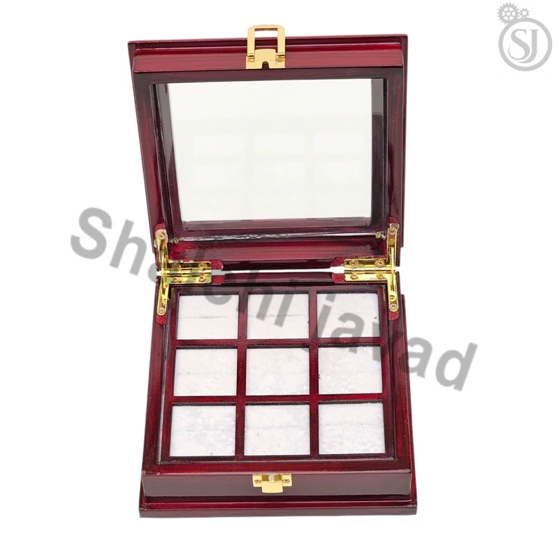 جعبه انگشتر 9 عددی شیشهای | قاب شیشهای پولیستر زرشکی مخصوص طلافروشی و نقرهفروشی