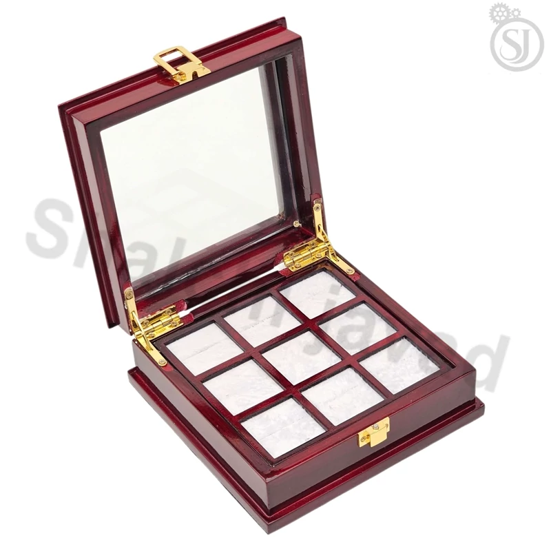 جعبه انگشتر ۹ عددی شیشهای که در بازار زرگری با نام قاب شیشهای ۹ عددی شناخته میشود، یکی از کاربردیترین و شیکترین ابزارهای زرگری برای نمایش و نگهداری انگشتر است.