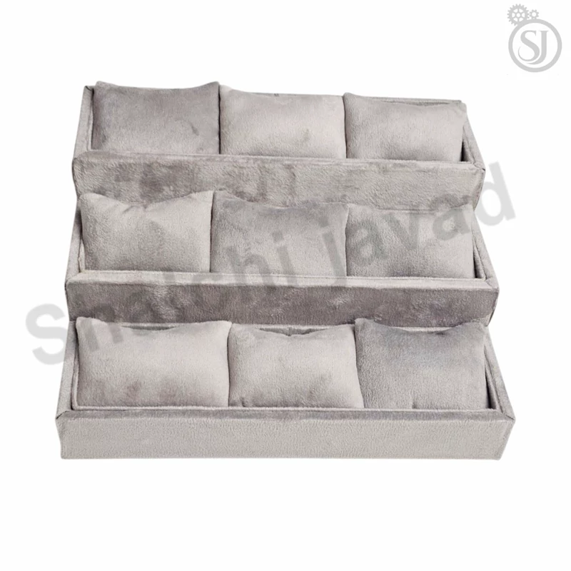 استند جواهرات بالشتکدار سه پله طوسی روشن 9 خانه | مناسب ساعت، گردنبند، دستبند و پابند