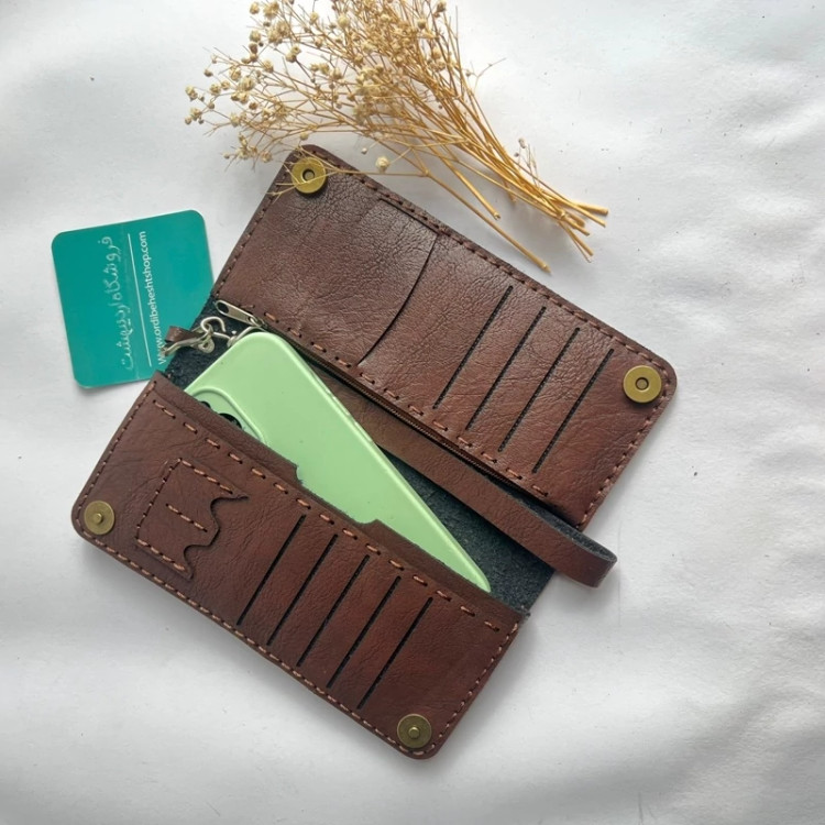 کیف پول چرم دست دوز طرح کیهان درجه یک جای موبایل کارت پول مدارک دارای 2 سال گارانتی چرم