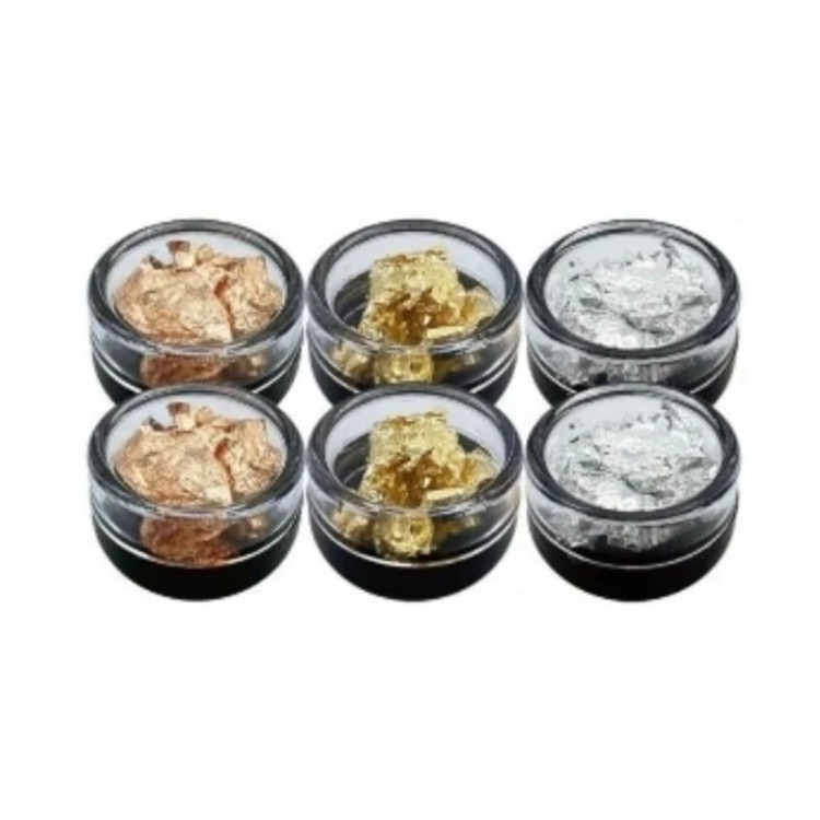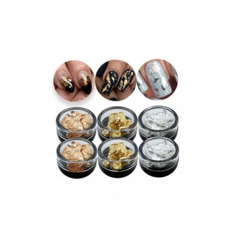 🔸 رنگهای موجود در این پک شامل ورق طلا، نقره و مس است که با درخشش بینظیر خود، جلوهای لوکس و شیک به ناخنهای شما میبخشند.