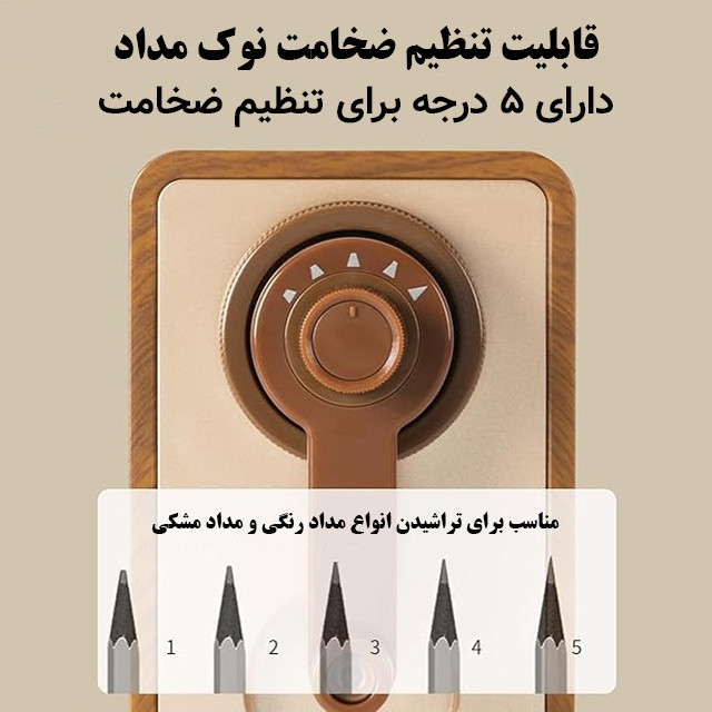 تیغ اسپایرال با بُرش 360 درجه - تیغ از جنس استیل ضد زنگ و مقاوم در برابر کُند شدن - قابلیت تنظیم درجه ضخامت نوک مداد در 5 درجه متفاوت - قابل استفاده برای انواع مداد معمولی، مداد رنگی، مداد طراحی، مداد کُنته و غیره - متریال بسیار با کیفیت