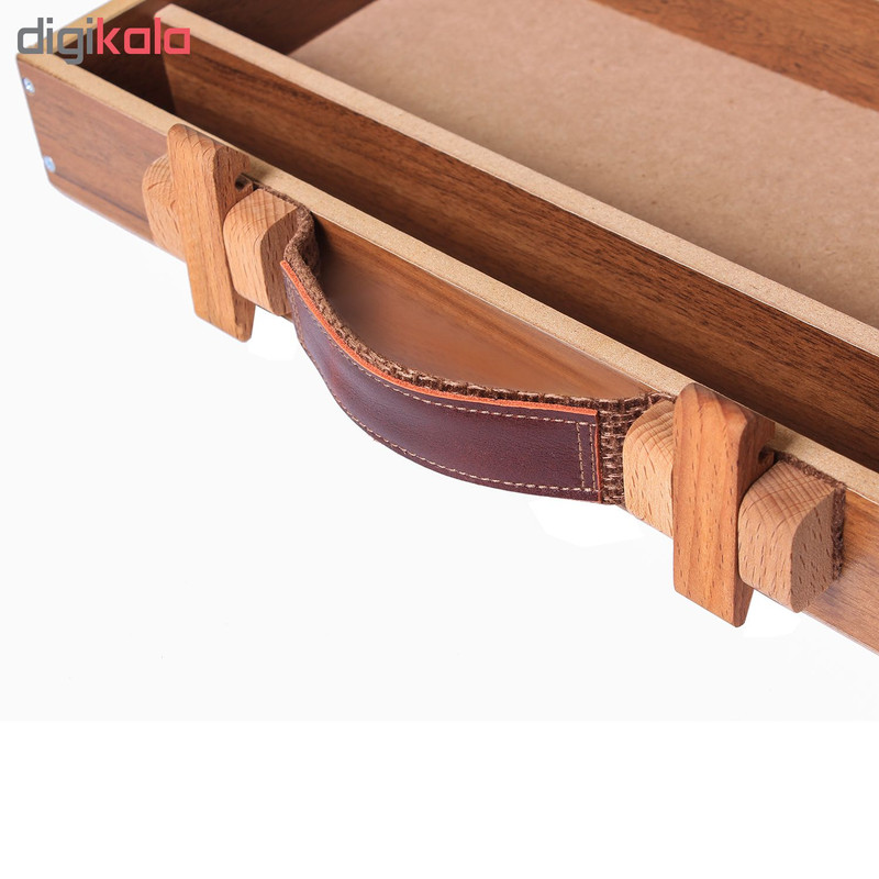 جعبه رنگ چوبی وسیله بسیار کاربردی برای هنرمندان میباشد،شما با کیف رنگ میتوانید تمامی قلموها،کاردک ها،انواع محلول های نقاشی،فرچه و بسیار از لوازم دیگر را داخل کیف قرار دهید.این کیف 2 طبقه شامل قسمت های مختلف میباشد تا بتوانید ابزار های مختلف را در جای مخصوص خود قرار دهید،برای تهیه این جعبه از بهترین چوب و ورق MDFاستفاده شده و یک عدد پالت رنگ روغن داخل جعبه قرار گرفته. طراحی و زیبایی این کیف نظر بسیار هنرمندان را به خود جلب کرده،معمولا رنگ های روغن کیف را سنگین میکنند و حمل آن دست را خسته میکند اما این محصول با دسته پارچه حمل آن را راحت تر کرده اگر به دنبال جعبه رنگ با کیفیت هستید بهترین گزینه برای خرید میباشد