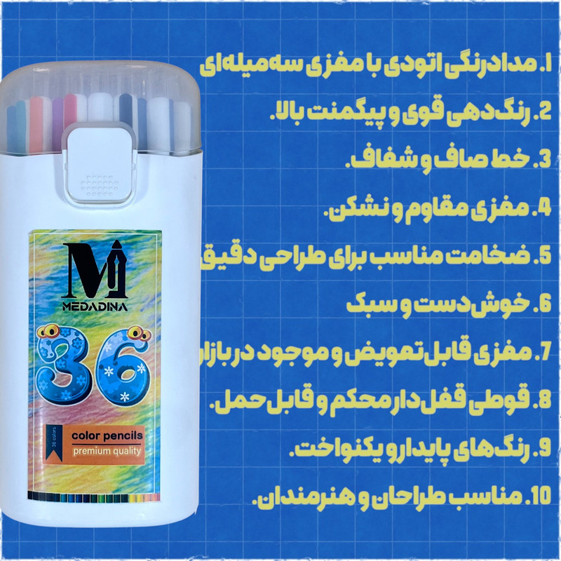 ویژگیها: پخش نشدن رنگ , امکان ترکیب رنگ یکپارچه , نوک محکم و مقاوم در برابر شکستن , قابلیت تراش آسان
