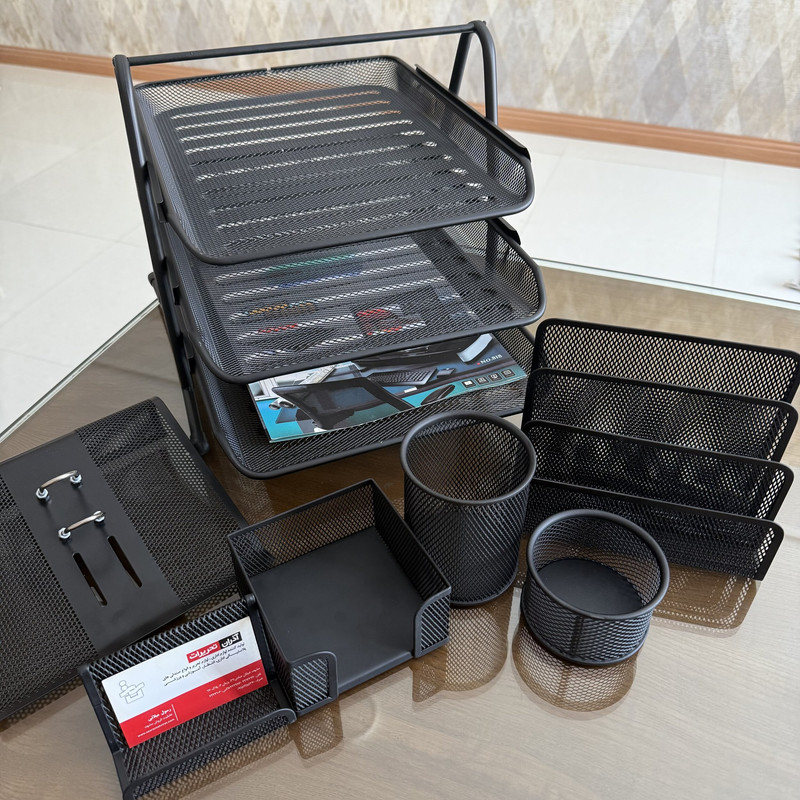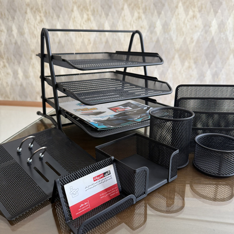 سایر توضیحات: اقلام ست : کازیه سه طبقه / جایادداشتی / جاقلمی / جاپاکتی / جاکارتی (از جاکارتی به عنوان جاموبایلی هم میتوان استفاده کرد ) / پایه تقویم / جاسنجاقی