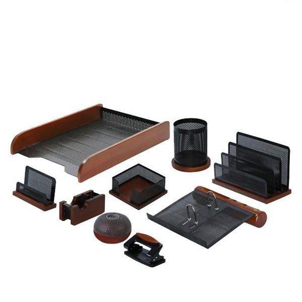 اقلام موجود در ست: کازیه , جای کاغذ یادداشت , پایه چسب , جامدادی رومیزی , جای نامه , جای گیره , پانچ