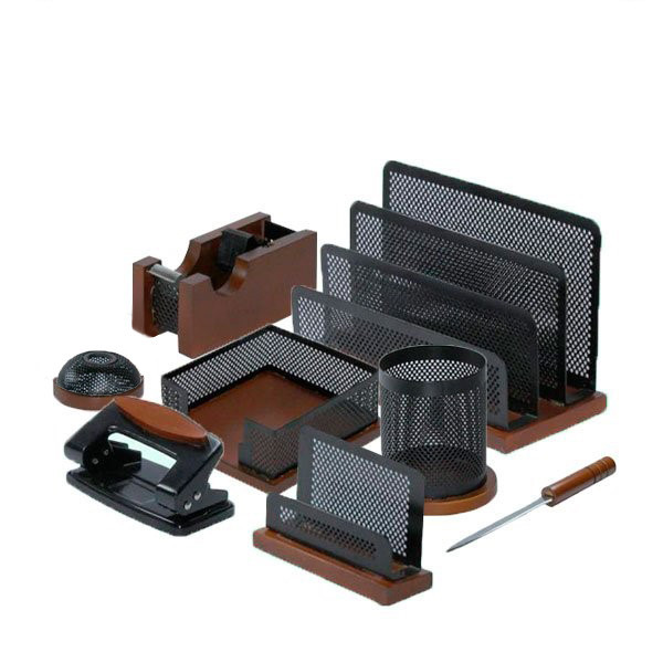اقلام موجود در ست: جای کاغذ یادداشت , پایه چسب , جامدادی رومیزی , جای نامه , جای گیره , پانچ
