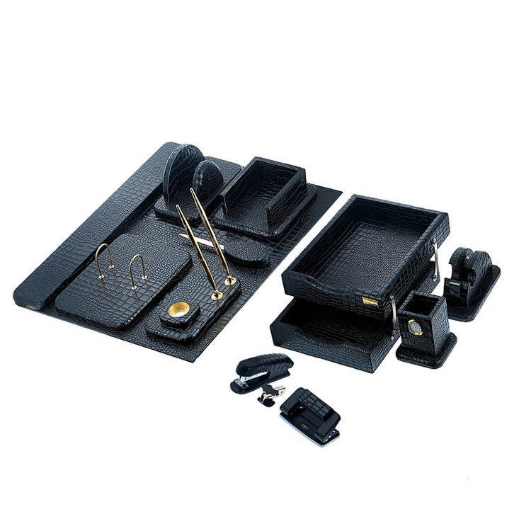 اقلام موجود در ست: کازیه , جاقلمی (استند خودکار) , جای کاغذ یادداشت , پایه چسب , جامدادی رومیزی , جای نامه , پانچ , منگنه , منگنه کش , استند تقویم